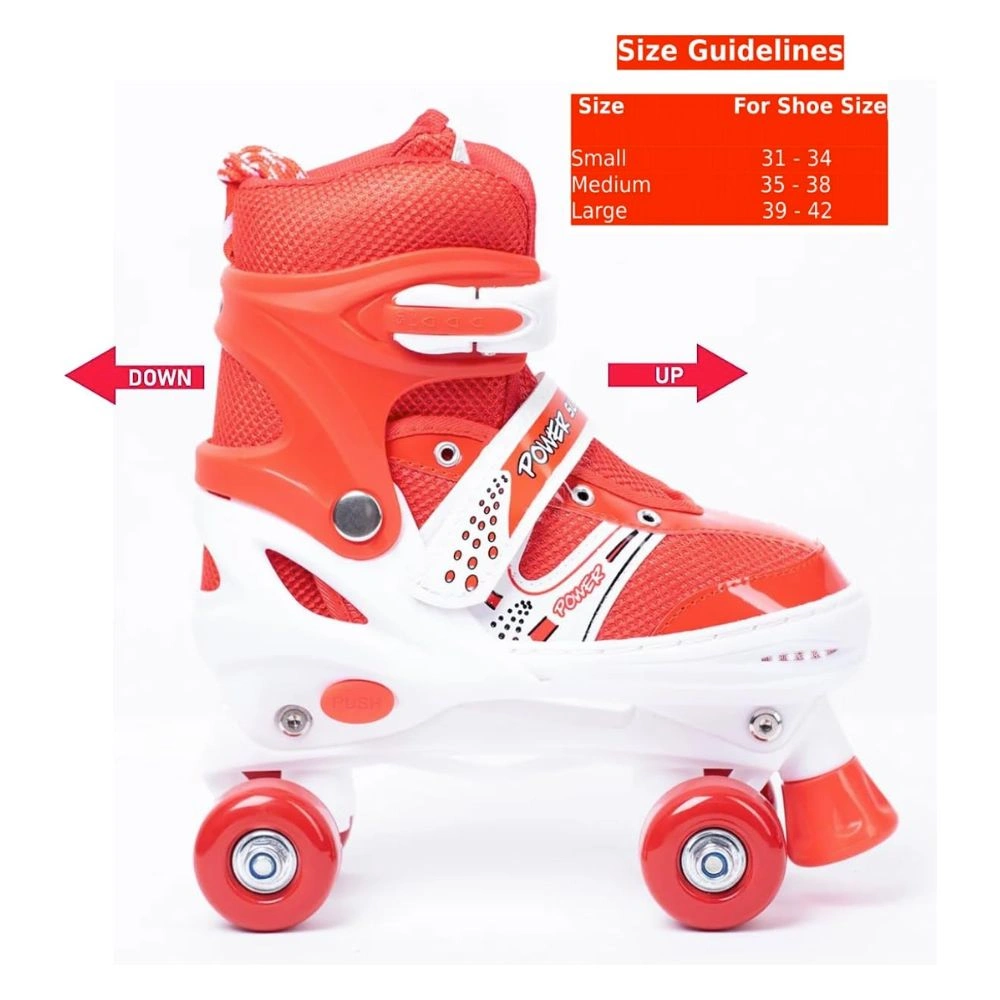 Give your kids the perfect blend of fun, safety, and comfort with our 4 Wheel Adjustable Roller Skate Shoes with Safety Guards. Designed for growing feet, these skates come in 3 adjustable sizes (Small 31–34, Medium 35–38, Large 39–42), ensuring a perfect fit for many years.