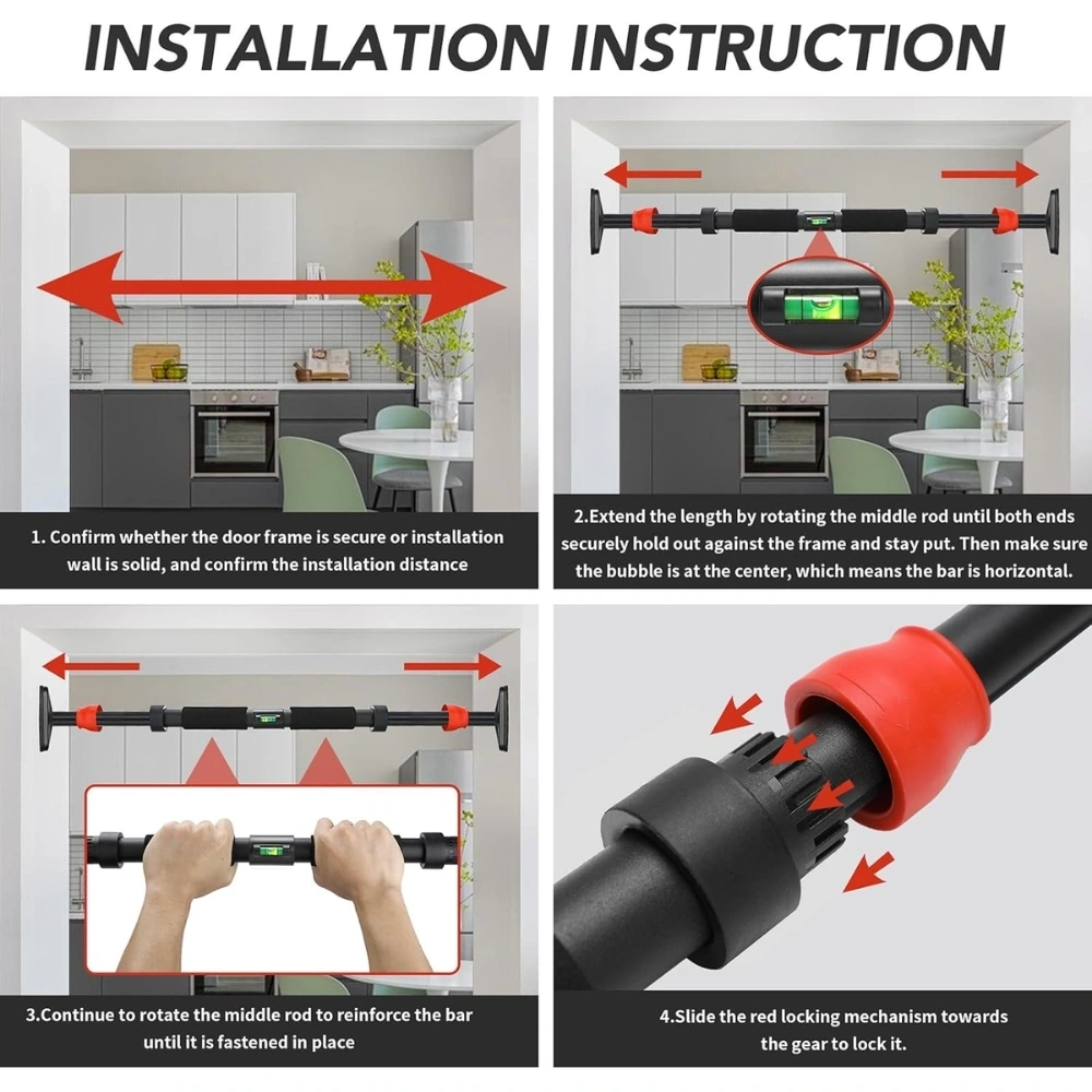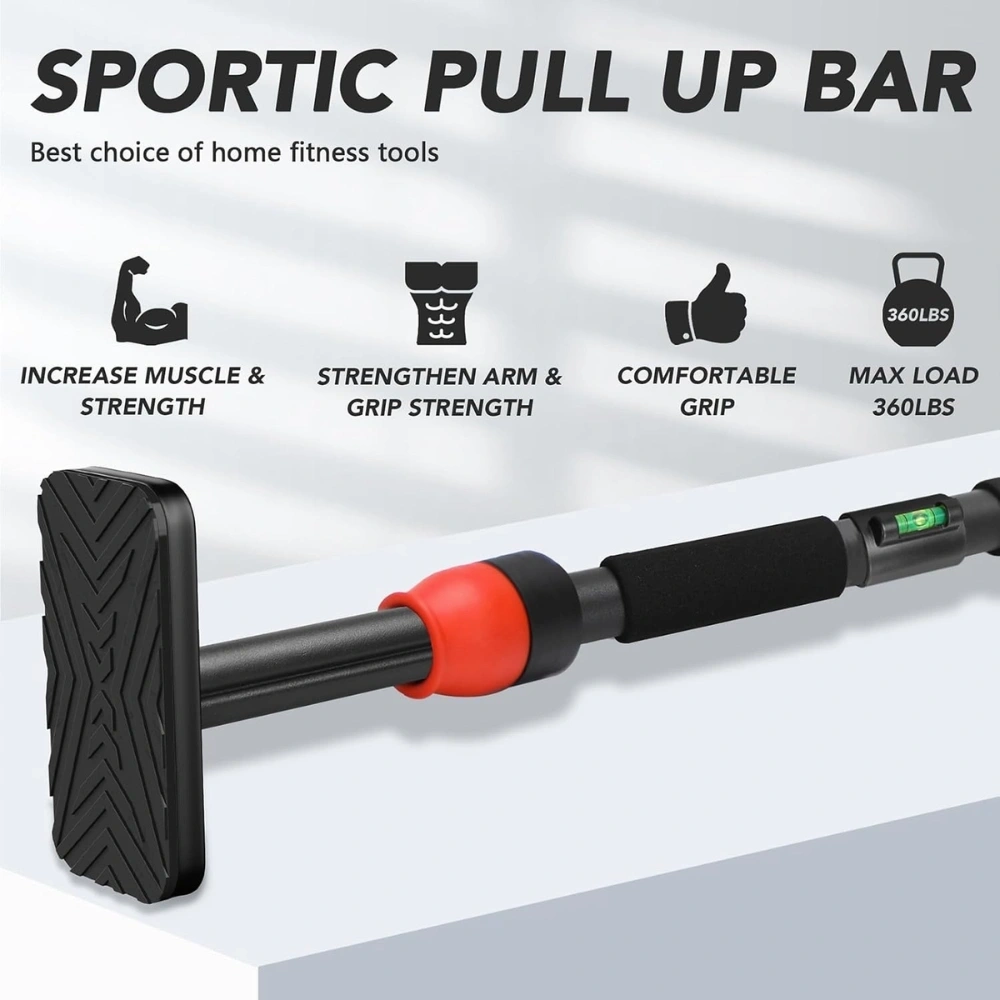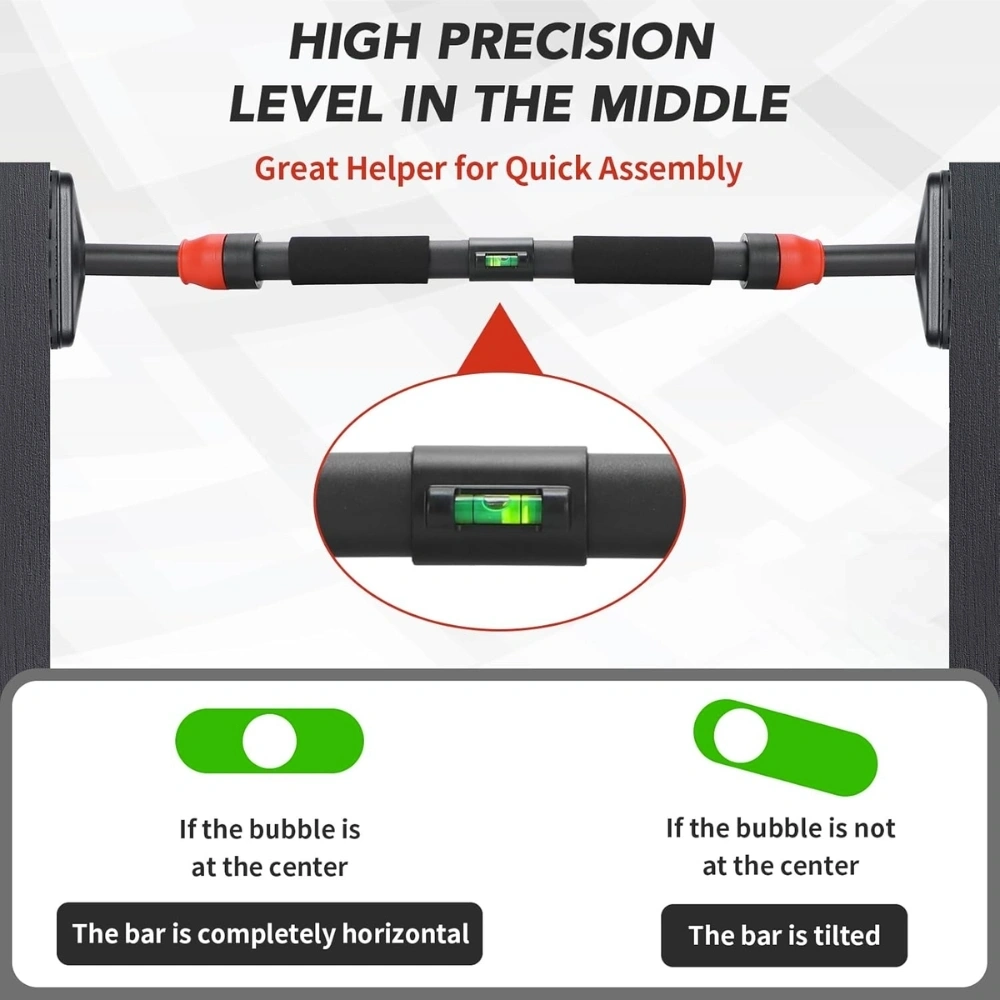 The adjustable extendable design fits most standard doorways, making it perfect for use in apartments, homes, or office spaces. Its built-in level indicator ensures proper alignment during installation, providing extra safety and stability before every workout.