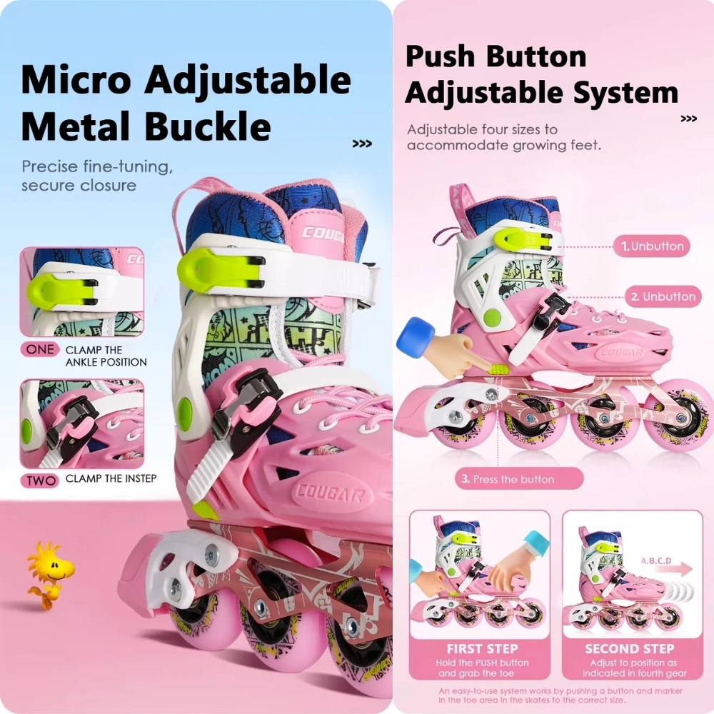 The adjustable size feature makes it easy to grow with your child—just press the button and adjust the size instantly. With a breathable inner lining, secure metal buckle system, and TPR brake, safety and comfort are always guaranteed.