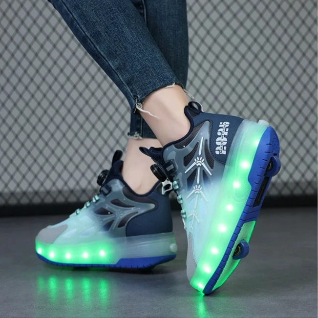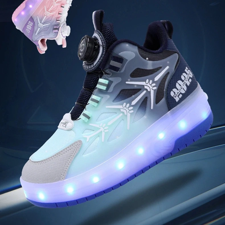 Let your kids shine while they roll! These LED Light Roller Skate Shoes feature two smooth wheels and bright, rechargeable lights that make every step and spin fun and exciting. Made from durable polyester with a breathable lining, these shoes ensure comfort and style for boys and girls alike. The buckle strap closure offers a secure fit, while the EVA outsole provides excellent grip and stability. Perfect for daily wear, outdoor play, and skating fun in all seasons.