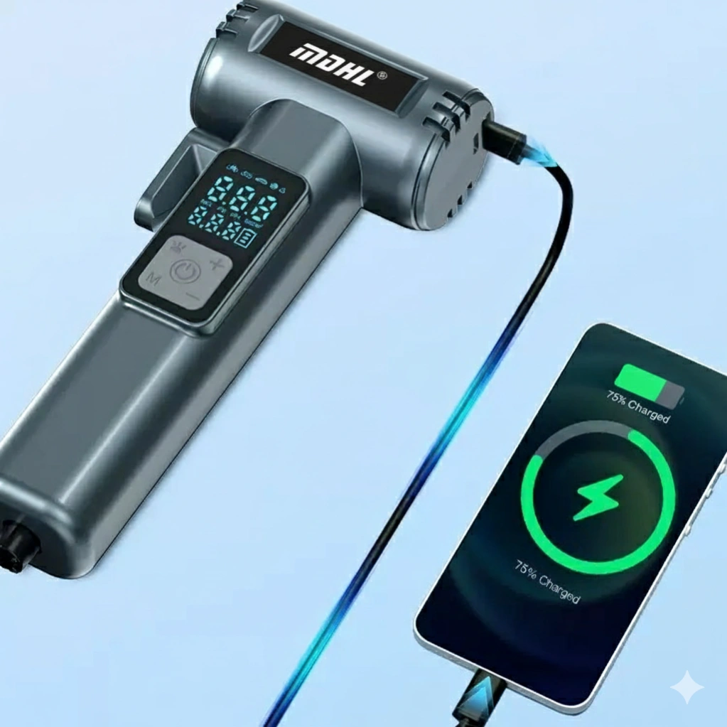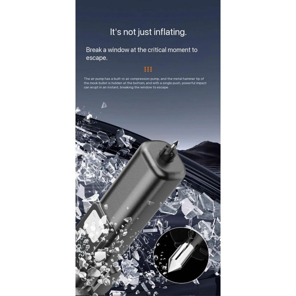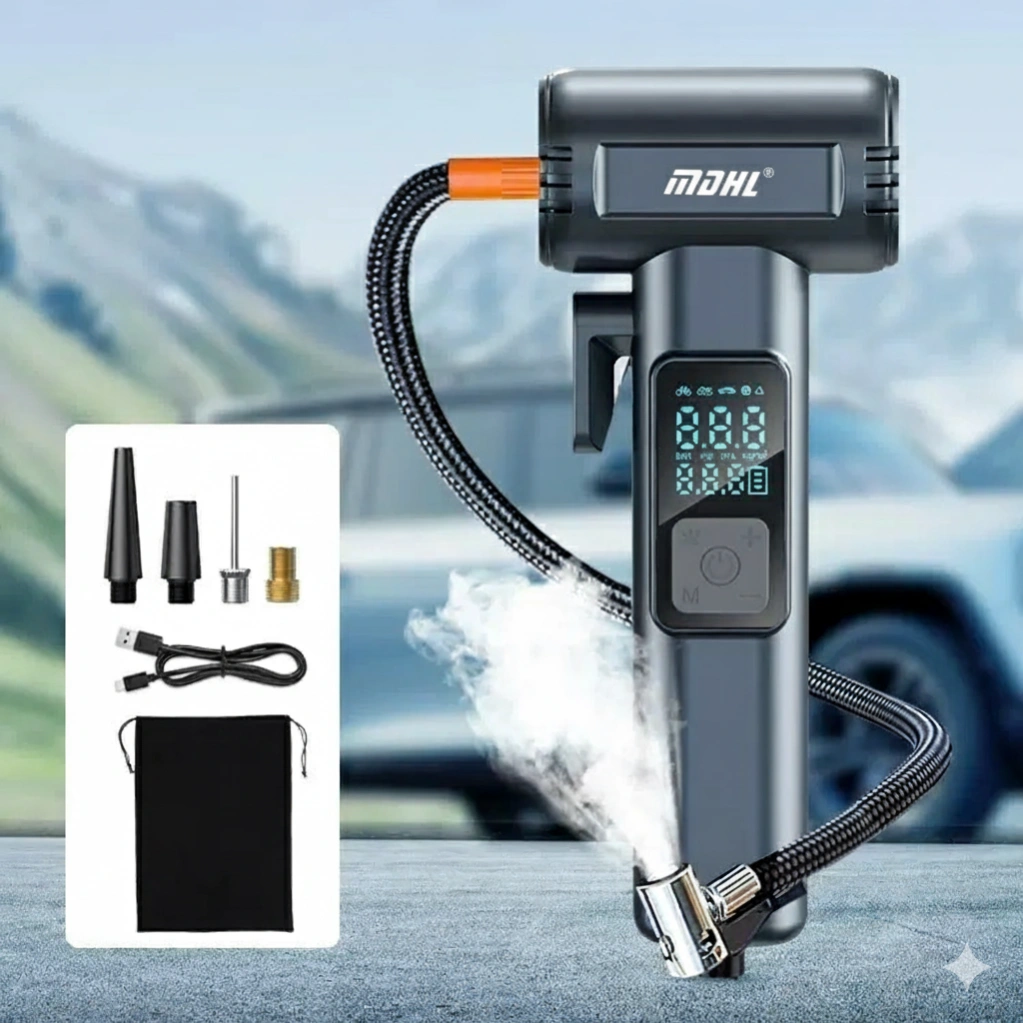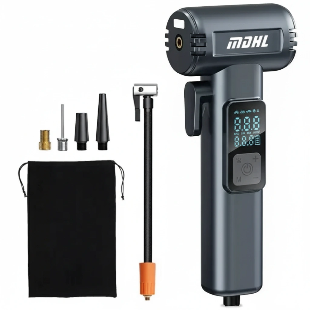 The MDHL MD-9170 is a powerful 150 PSI portable tire inflator designed for ultimate roadside safety. Featuring a digital LCD display, 5 smart inflation modes, automatic shut-off, emergency power bank, LED flashlight, SOS warning light, safety hammer, and seatbelt cutter—this compact device is your all-in-one travel companion for cars, bikes, motorcycles, and outdoor gear.