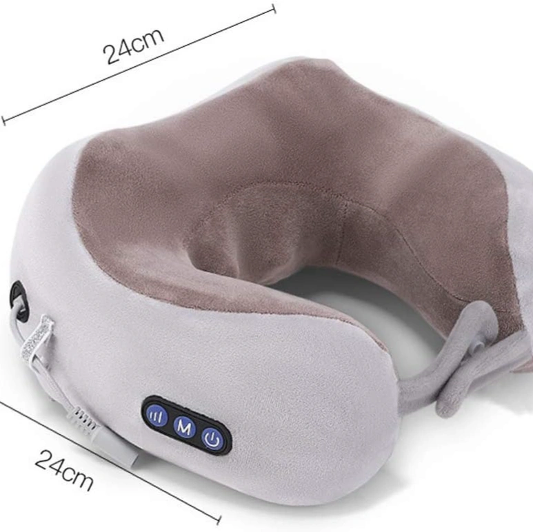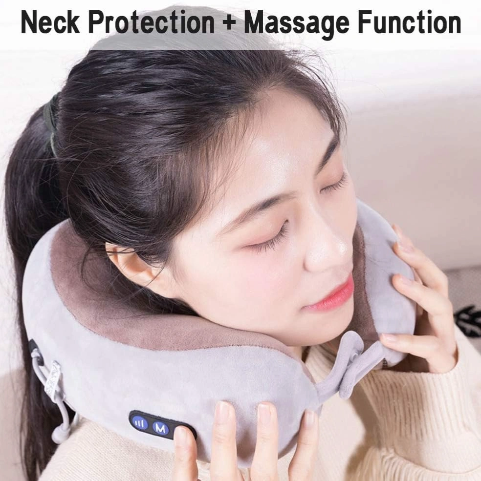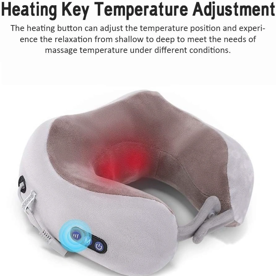 Electric U-shaped neck pillow with dual motor, heating, and kneading massage. Perfect for travel in airplane, car, bus, or train — relieves neck pain and fatigue.