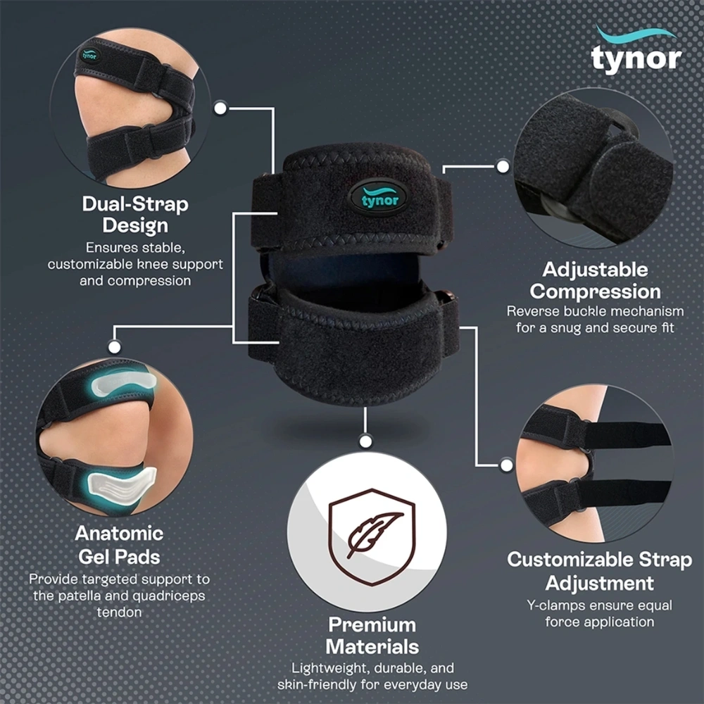 Stay active and pain-free with the Tynor Dual Patellar Knee Support, specially designed to provide targeted support and protection to the kneecap. Its dual strap system ensures precise control over patellar movement, making it ideal for managing patellar instability, discomfort, and inflammation.